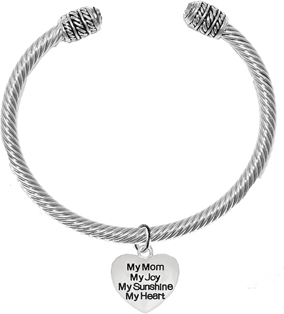 Message Bracelet, My Mom, My Joy, My Sunshine, My Heart, Breathtaking Adjustable Silver Cable Cuff Bracelet, Hypoallergenic, Safe-Nickel, Lead, Cadmium Free