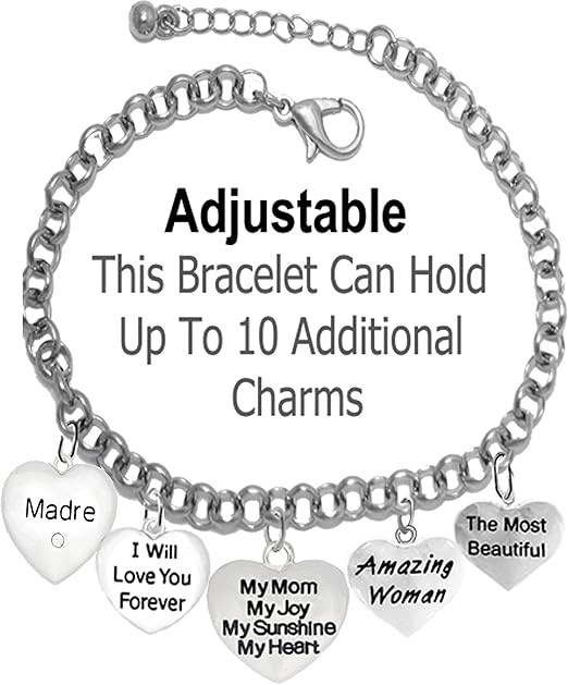 Mom, Madre, Crystal Heart Madre, I Will Love You Forever, My Mom, My Joy, My Sunshine, My Heart, Amazing Woman, The Most Beautiful, Adjustable, Hypoallergenic Safe- No Nickel. Lead, Or Poisonous Cadmium