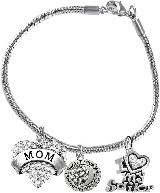 Navy Mom, " I Love You To The Moon And Back ", Crystal I Love My Sailor, Licensed Navy Charm, Snake Chain Bracelet, Hypoallergenic, Safe-Nickel, Lead, Cadmium Free