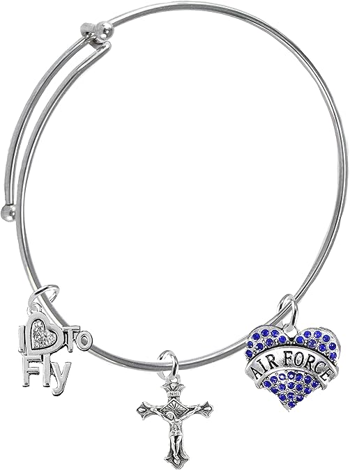 • Air Force, I Love To Fly, Genuine Crystal, Crucifix, Adjustable Miracle Wire Bracelet, Hypoallergenic, Safe-Nickel, Lead Free