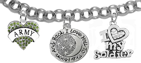 Army, " I Love You To The Moon And Back ", Crystal I Love My Soldier, Licensed Army Charm, Adjustable Rolo Chain Bracelet, Hypoallergenic, Safe-Nickel, Lead, Cadmium Free