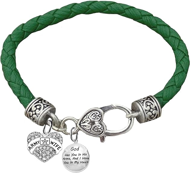 Army Wife, God Has You In His Arms, And I Have You In My Heart, On A Genuine Green Leather Bracelet, Hypoallergenic Safe, No Nickel, Lead, Or Poisonous Cadmium In Bracelet