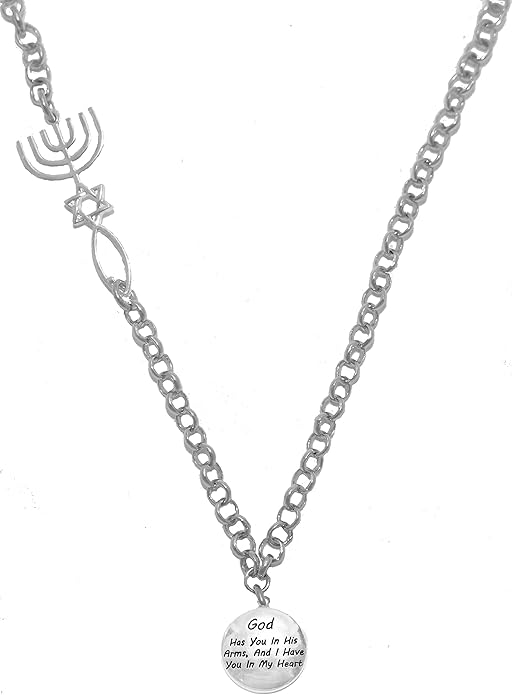 'God Has You In His Arms, And I Have You In My Heart', Messianic Seal of Jerusalem, Adjustable Necklace With Menorah, Star Of David, Christian Fish, Hypoallergenic, Safe-Nickel, Lead, Cadmium Free