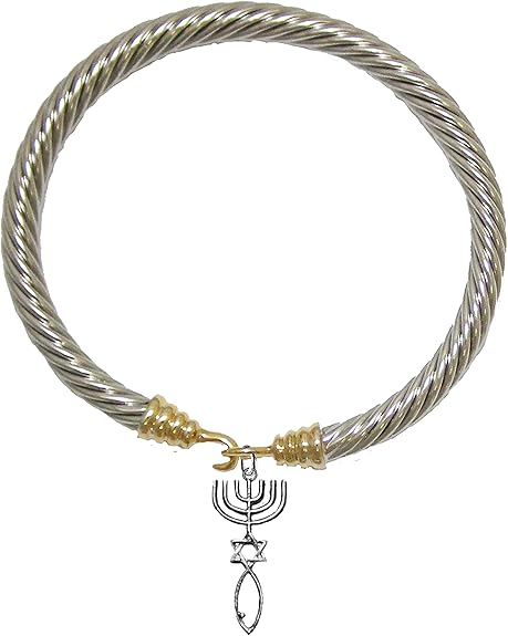 Messianic Seal of Jerusalem with Menorah, Star of David, Christian Fish (Ichthys) On A Gold/Silver Cable Bracelet, Hypoallergenic, Safe-Nickel, Lead, Cadmium Free
