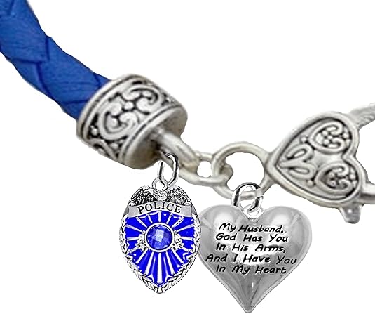 • Policeman, My Husband, God Has You In His Arms, And I Have You In My Heart, Blue Leather Bracelet, Hypoallergenic, Safe-No Nickel, Lead,or Cadmium. FREE SHIPPING!