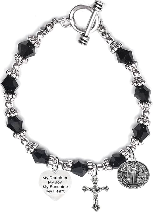 Saint Benedict Protective Charm, My Daughter, My Joy, My Sunshine, My Heart, And Prayer, Protect Me From Harm, From Evil, Hypoallergenic Black Crystal Bracelet, Nickel, Lead, Cadmium Free
